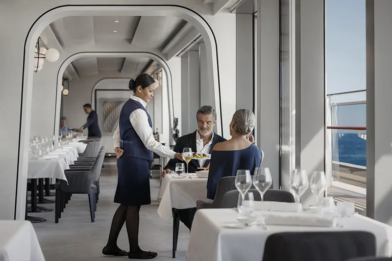 お客様とホストの比率は業界トップクラスの1.25対1です。さらに原則として、採用の段階では船での就労経験よりも、ラグジュアリーなホスピタリティ業界での経験を重視されます。優れた人材を自社で直接雇用し教育を行うことで、ホストはエクスプローラ ジャーニーの哲学を常に学んでいます。その結果、各ホストがホスピタリティのプロとしての誇りを持ち、常に先を読み、お好みに応じたインテリジェントなサービスを可能にしています。親しみやすく、心からリラックスできる心地よいサービスは、ご乗船されたお客様から特に好評です。